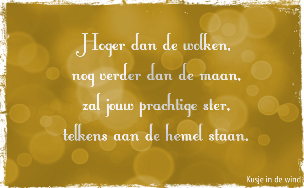 Ik kreeg de laatste tijd regelmatig de vraag of het niet mooi zou zijn de gedichtjes op de Facebook-pagina van ‘Kusje in de wind’ in een bundel onder te brengen. Een bijzonder idee vind ik, om zo een troostboekje te maken. Tegelijkertijd realiseer ik me dat Moederdag en Vaderdag er al snel weer aankomen en dat is voor alle sterrenouders moeilijk. Of je naast je wolkenkindje nog ander kroost hebt of niet, deze dagen zullen nooit meer hetzelfde zijn… Het gemis van het kindje dat nooit een versje op zal lezen of een knutselwerkje zal maken, is dan zo goed voelbaar.
